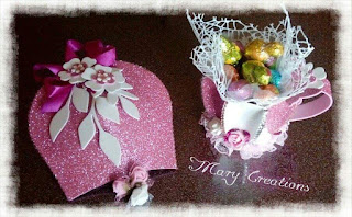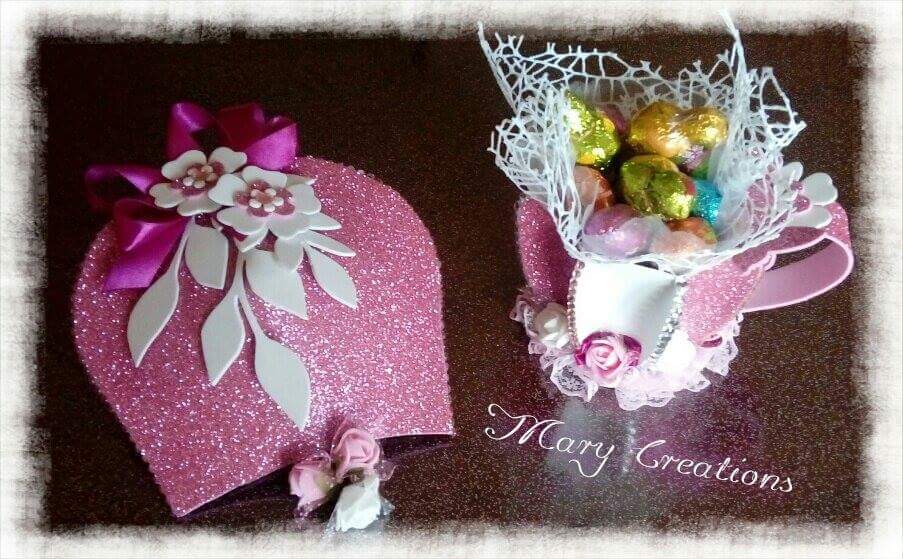 Dopo aver intagliato e incollato tutte le parti, ho decorato con strass, fiori e farfalle, infine ho inserito un tulle e un centrino traforato e riempito con ovetti di cioccolato.